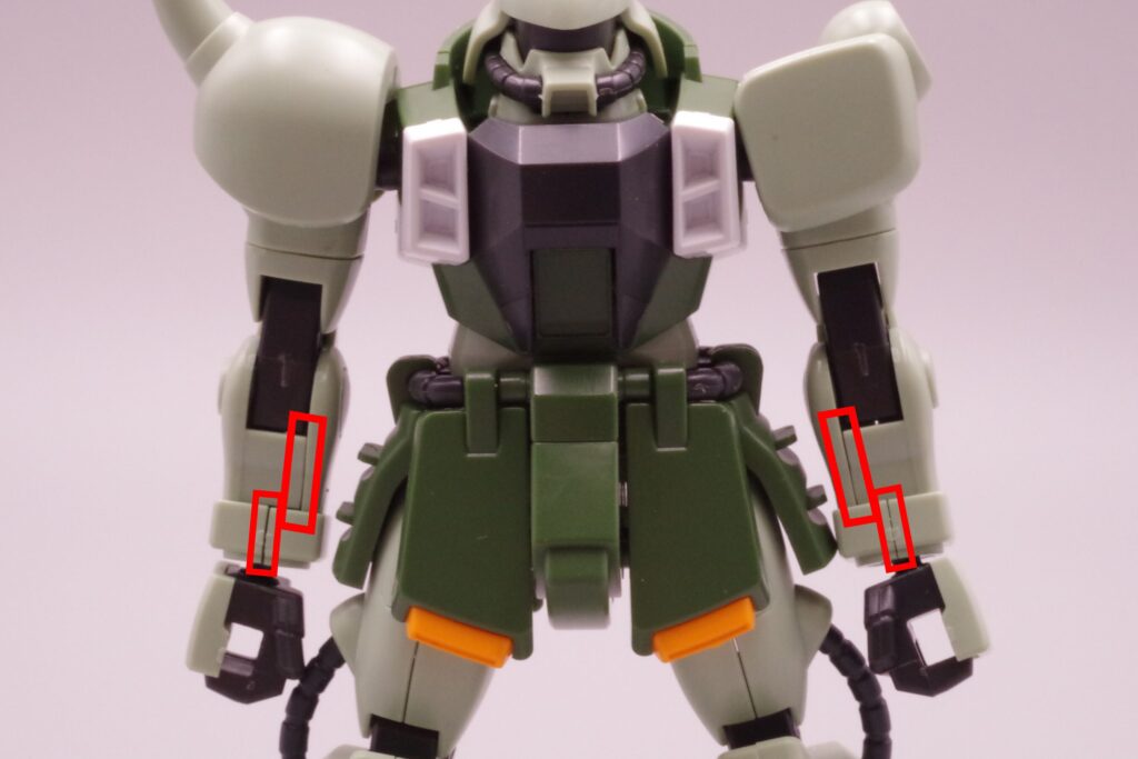 両腕はおよそ水平まで上がり、肘関節も90度まで曲がるので、腕の可動は優秀です。あと、二の腕もパーツが分割されているので腕を開くことができます。