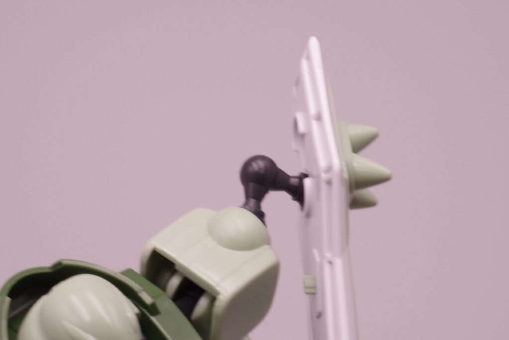 股下にアクションベース用ジョイントはありませんが、アクションベース2付属のはさみ込むタイプのジョイントパーツを使うか、背中のジョイントを使うことでアクションベースを使用できます。