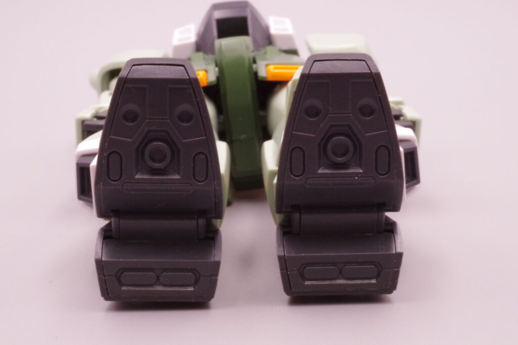 両脚はそこそこ開き、膝関節も90度まで曲がるので、細身のMSということもあってこの頃のキットの中では結構優秀な可動域だと思います。ちなみに片膝を立てる姿勢も可能ですが、膝の形状からあまり安定はしません。